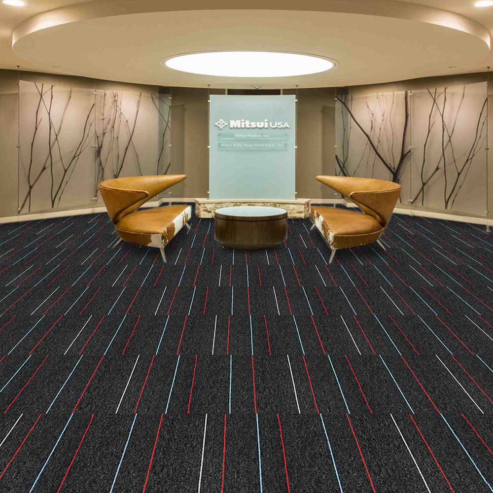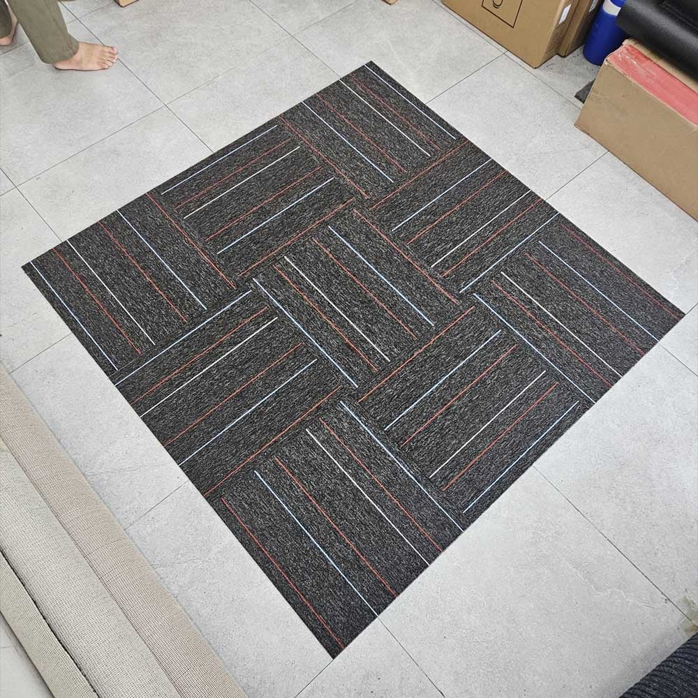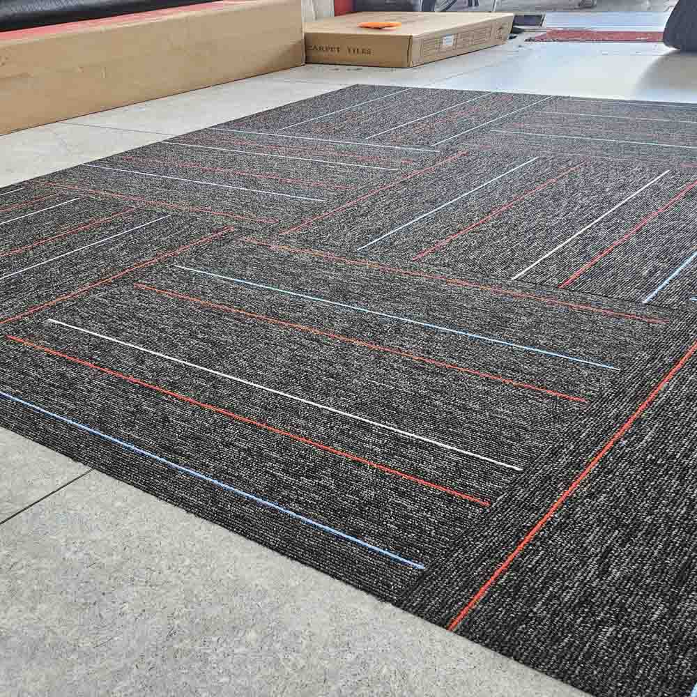 Thảm gạch SUN 05 là thảm dạng sọc xanh xen kẽ sọc đỏ trên thảm nền xám đậm, họa tiết sọc phù hợp cho nhiều mặt sàn như thảm trải sàn bida thảm lót văn phòng thảm trải showroom.