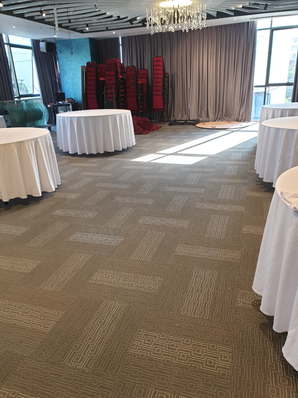 Khách hàng có thể phối thảm gạch Terrazo với thảm trơn đơn màu hoặc thảm cùng hoa văn nhưng khác màu để tạo hiệu ứng hoặc phân khu làm việc, hoặc lắp 1 mẫu thảm với dạng caro hoặc 1 chiều.