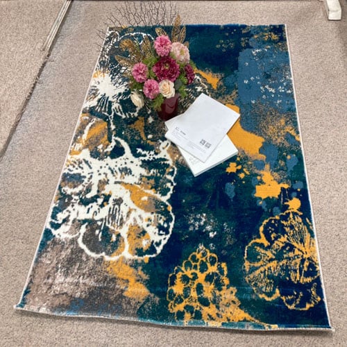 Hoa văn thảm trải bàn ghế ZC 802 là với điểm nhấn là bông hoa lớn, xen kẽ với những hoa nhỏ, tạo điểm nhấn ấn tượng cho không gian sử dụng, nền chủ đạo là xanh dương, phối cùng với tông kem và vàng nên có thể phối hợp với nhiều phong cách nội thất khác nhau.