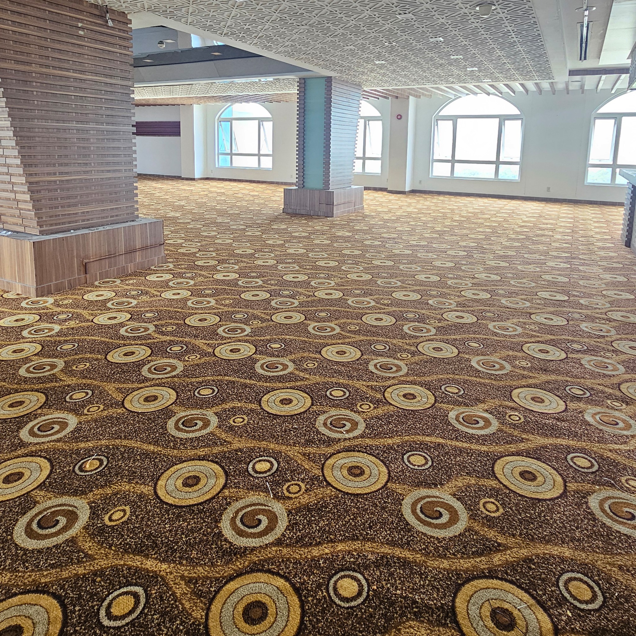 Thảm Wilton SA 1045 với tông thảm nền chủ đạo là màu kem vàng, điểm các bông tròn màu vàng nhạt và đen, hoa văn kiểu vân may tạo độ uyển chuyển, mềm mại rất thích hợp làm thảm lót sảnh tiệc cưới, thảm lót phòng hội nghị cấp cao.